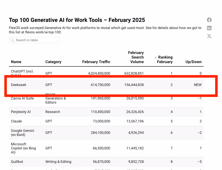 Not only did DeepSeek take the number two spot behind ChatGPT, but it also surpassed all AI platforms previously seen as competing with OpenAI's powerhouse LLM: Claude (#5), Gemini (#6), and Copilot (#7.)