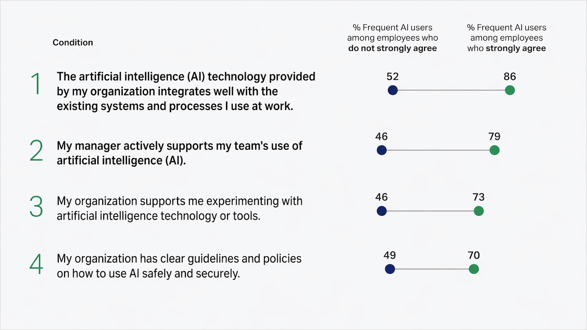 Yet fewer than one in three U.S. employees in AI-implementing organizations strongly agree their manager actively supports their team's use of the technology. In Germany it's 21%.