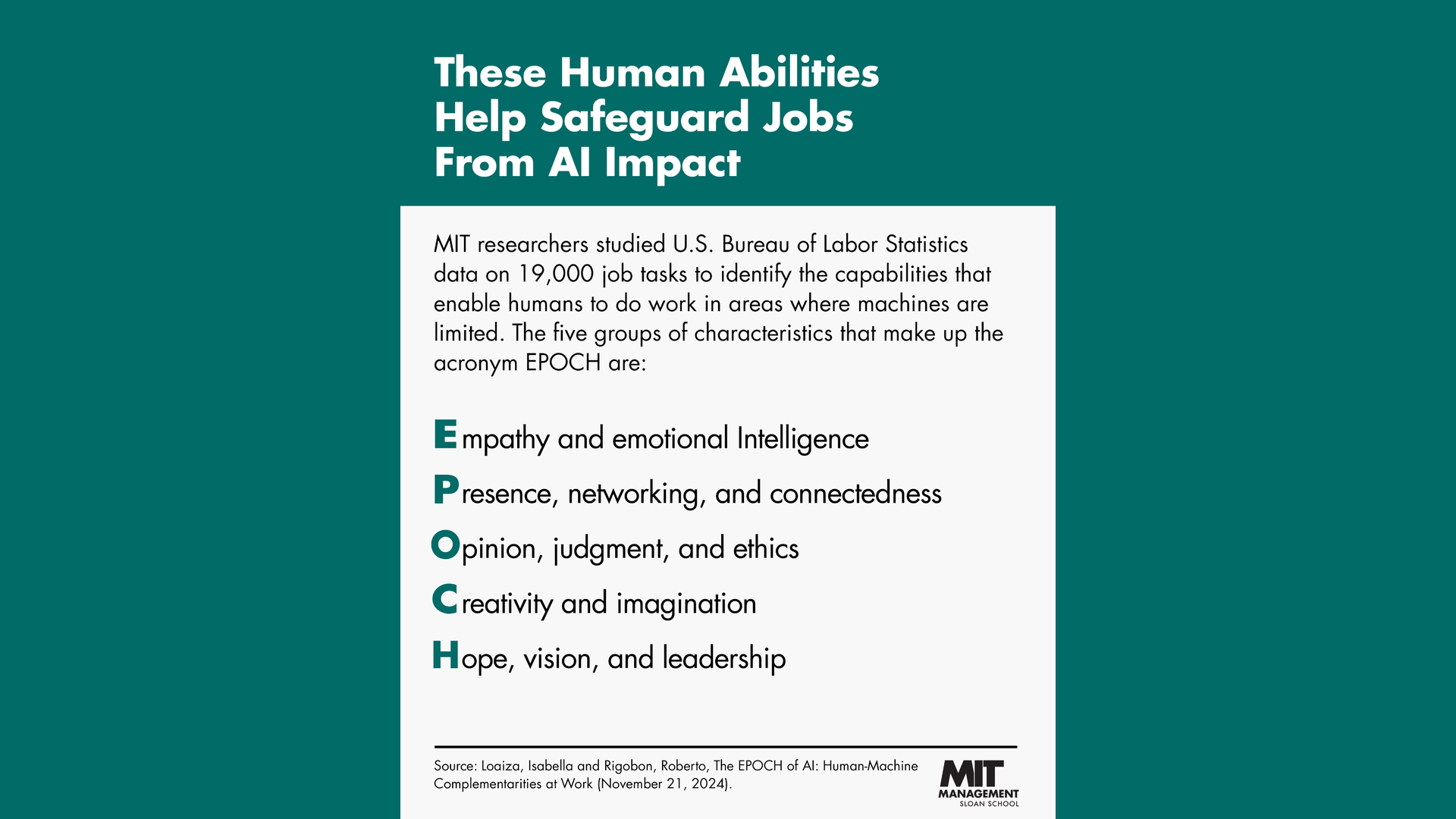 MIT Sloan researchers have developed a framework called EPOCH, one of the most rigorous answers to this question. EPOCH outlines five uniquely human capability groups: Empathy, Presence, Opinion/Judgment, Creativity, and Hope, that AI struggles to replicate.